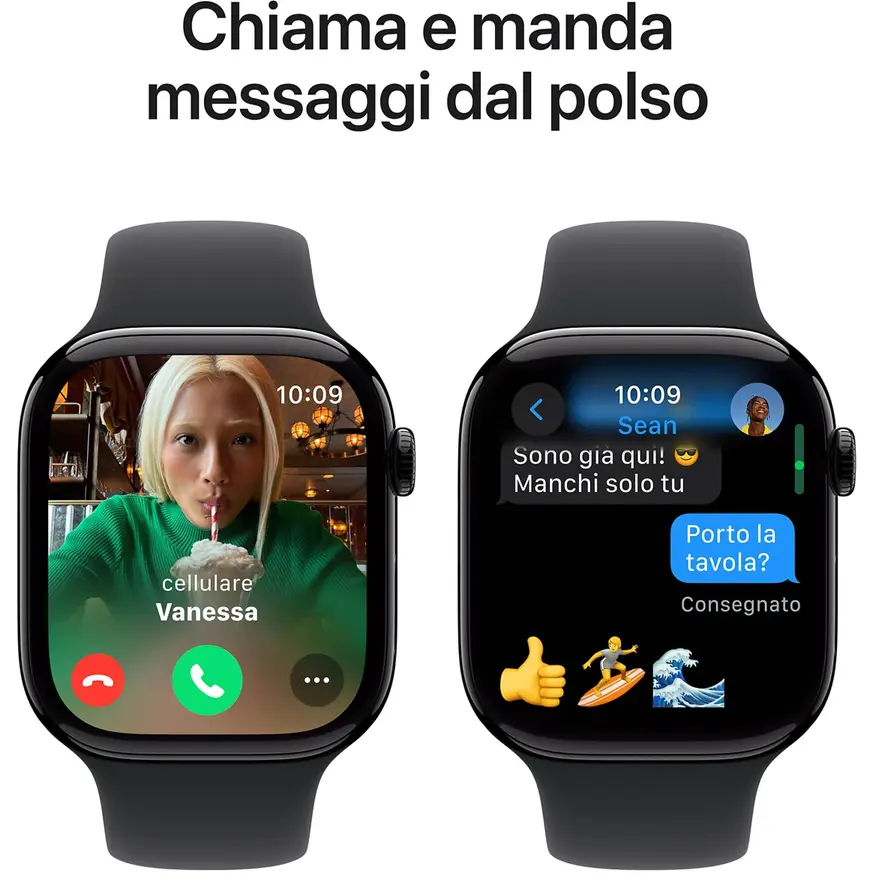 Manda messaggi, rispondi a una chiamata, ascolta musica e podcast, usa Siri e leggi le notifiche ovunque sei. Insieme al tuo iPhone o sotto rete Wi-Fi, Apple Watch Series 10 (GPS) ti tiene in contatto col mondo.