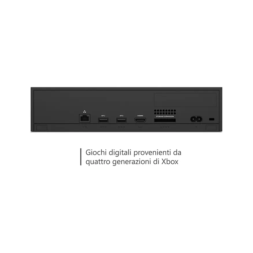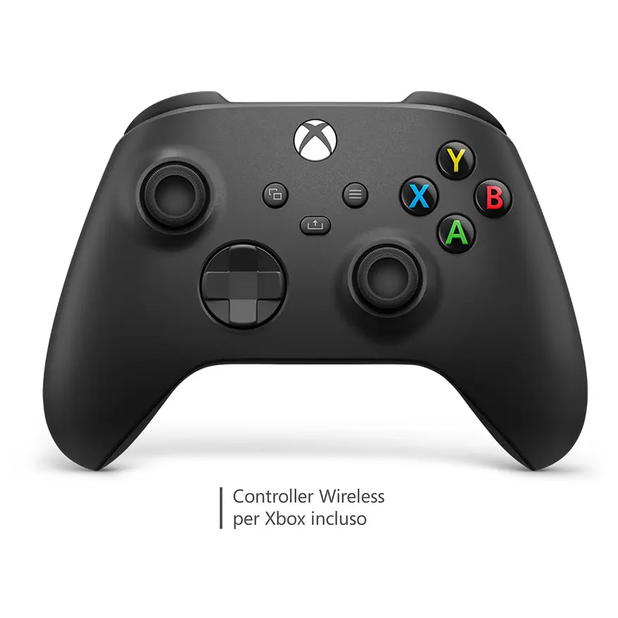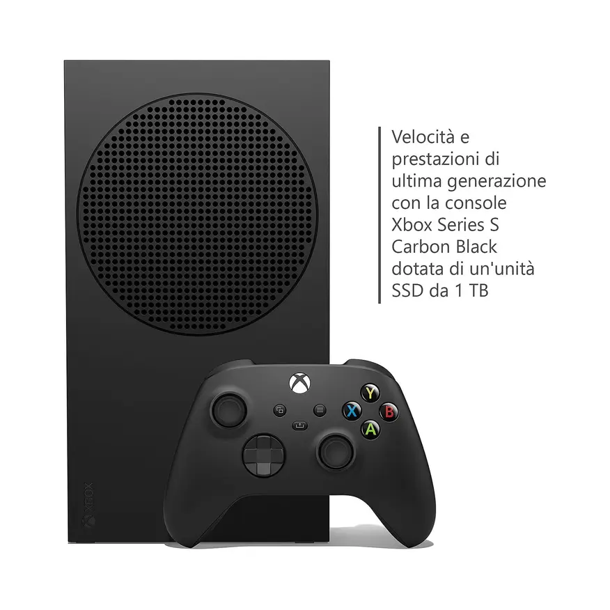 Ottieni velocità e prestazioni di nuova generazione con la console Xbox Series S Carbon Black dotata di un'unità SSD da 1 TB. Ottieni il massimo da ogni minuto di gioco con Quick Resume, tempi di caricamento fulminei e gameplay fino a 120 FPS, il tutto basato su Xbox Velocity Architecture. Divertiti con giochi digitali provenienti da quattro generazioni di Xbox, con centinaia di titoli ottimizzati potrai giocare come mai prima d’ora. Ottieni il massimo dalla tua Xbox Series S con Game Pass Ultimate (abbonamento venduto separatamente) e sii il primo a giocare a nuovi giochi come Starfield e Forza Motorsport il giorno stesso del lancio. In più, divertiti con centinaia di giochi come Minecraft Legends, Halo Infinite e Forza Horizon 5 con i tuoi amici su console, PC e cloud. Con nuovi titoli aggiunti continuamente, c'è sempre qualcosa di nuovo a cui giocare. *Informazioni importanti:Utilizzabile solo con giochi digitali; la console non riproduce dischi fisici. 120 fps: sono necessari contenuti e schermi supportati; utilizzabile su Xbox Series S non appena il contenuto sarà disponibile. Xbox Game Pass: il catalogo dei giochi varia nel corso del tempo (xbox.com/gamepass). Starfield e Forza Motorsport sono previsti per il 2023. Xbox Cloud Gaming (Beta) richiede un abbonamento a Xbox Game Pass Ultimate e un gioco supportato; potrebbe essere necessario un controller Bluetooth supportato (tutti in vendita separatamente). Solo in alcune aree geografiche e su alcuni dispositivi. Si applicano limiti alla trasmissione in streaming. La disponibilità del server e i tempi di attesa possono variare. Richiede una connessione Internet; vengono applicate le tariffe dell'ISP. xbox.com/cloudgamingXbox Game Pass: il catalogo dei giochi varia nel corso del tempo, in base all'area geografica e al dispositivo. Xbox Cloud Gaming (Beta) richiede un abbonamento a Xbox Game Pass Ultimate e un gioco supportato; potrebbe richiedere un controller Bluetooth® supportato (tutti in vendita separatamente). Solo in alcune aree geografiche e su alcuni dispositivi. Si applicano limiti alla trasmissione in streaming. La disponibilità del server e i tempi di attesa possono variare. È necessaria una connessione Internet; vengono applicate le tariffe del provider di servizi Internet. xbox.com/cloudgaming
